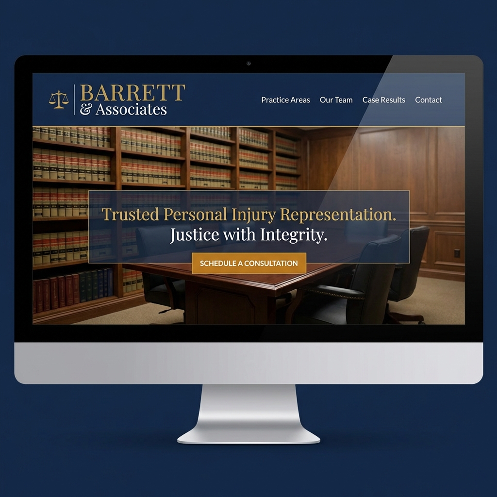 Authoritative legal presence with case results, practice areas, and AI-generated attorney headshots. Built for lead generation.